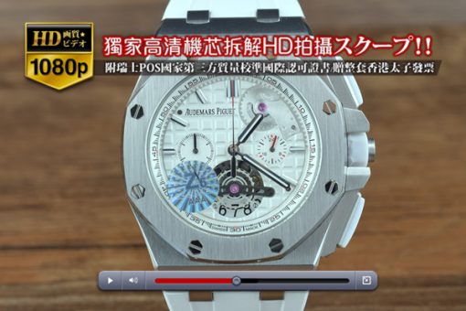 Audemars Piguet愛彼(V5工廠-1080p視頻)Royal oak offshore chronograph皇傢橡樹離岸型系列 日本VK石英機芯 系列 Royal oak offshore 尺寸 表殼直徑44mm x厚度14.5mm機芯 Japanese VK系列 石英機芯碼表機芯功能 時針、分針、小秒針(6點位小秒)、中心計時大秒針9點位小秒針 – 30分鐘顯示、3點位小秒針 – 24小時顯示2點位按把 – 開始/停止 計時、4點位按把 – 復位計時碼表表殼 316L不銹鋼磨砂表殼,表殼分為中框、表圈、背蓋組成表圈 316L不銹鋼表圈-磨砂工藝處理,銀色內表圈玻璃材質 鍍膜礦物玻璃面盤 白色表盤鐫刻“Méga Tapisserie”超大型格紋裝飾,銀色定時器表帶 白色橡膠表帶、精鋼針式扣後蓋 不銹鋼背蓋表冠 鎖入式表冠是否防水 生活防水
