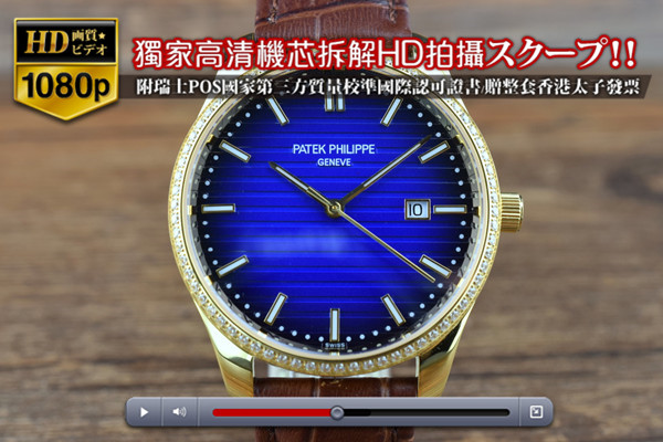 Patek Philippe百達翡麗(男表)Calastrava系列腕表 電鍍黃金表殼-鑲嵌水鉆表圈 裝載A2824-2自動機芯 系列 Calastrava尺寸 表殼直徑41mm x厚度11mm機芯 Asian 2824-2 25J自動機械機芯、擺輪頻率:每小時28,800 次功能 時針、分針、中心大秒針、日歷(3點位窗式顯示)表殼 316L不銹鋼拋光表殼-電鍍18k黃金,表殼分為中框、表圈、背蓋組成表圈 316L不銹鋼-圓拱形外圈-電鍍18k黃金-CNC鑲嵌一圈水鉆玻璃材質 透明抗磨損藍寶石玻璃面盤 藍色條紋表盤、夜光顯示小時時標表帶 棕色真皮表帶、針式扣後蓋 旋入式、316L不銹鋼-透明玻璃組合表冠 推拉式是否防水 生活防水