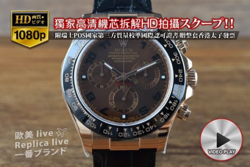 Rolex勞力士(Noob工廠-1080p視頻)宇宙計型迪通拿系列 電鍍玫瑰金表殼- 7750計時碼表自動機芯 系列 Daytona 尺寸 表殼直徑40mm x厚度14.5mm機芯 Asian 7750 25J計時碼表自動機械機芯、6點位小秒、擺輪頻率:每小時28,800 次功能 時針、分針、小秒針(6點位小盤)、中心計時大秒針3點位小秒針 – 30分鐘顯示、9點位小秒針 – 12小時顯示 2點位按把 – 開始/停止 計時、4點位按把 – 復位計時碼表表殼 316L不銹鋼拋光表殼-電鍍18k玫瑰金,表殼分為中框、表圈、背蓋組成表圈 黑色陶瓷表圈、表圈有計速刻度玻璃材質 透明抗磨損藍寶石玻璃面盤 咖啡色面盤、咖啡色定時器、黑色阿拉伯數字時標表帶 黑色皮質表帶、蠔式保險折迭扣後蓋 不銹鋼後蓋-電鍍18k黃金、旋入鎖緊表冠 鎖入式表冠是否防水 生活防水