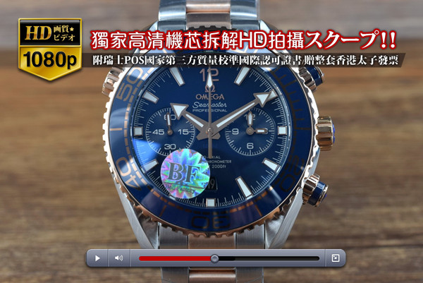 Omega歐米茄(BF工廠)Seamaster海馬系列海洋宇宙600米腕表 不銹鋼表殼-裝載9900計時自動機芯 系列 Seamaster尺寸 表殼直徑45.5mm x厚度20mm機芯 精仿9900同軸至臻天文臺自動機械機芯基礎機芯:Asian 7750計時碼表自動機械機芯功能 時針、分針、小秒針(9點位)、中心計時大秒針、日期(6點位窗式顯示)3點位小秒 – 12小時計時表殼 316L不銹鋼材質-磨砂工藝,表殼分為中框、表圈、後蓋組成表圈 316L不銹鋼材質底座、藍色表圈玻璃材質 弧形透明抗磨損藍寶石玻璃面盤 藍色表盤、嵌入式夜光時標表帶 不銹鋼鏈節表帶、中間部分電鍍玫瑰金、精鋼折迭扣後蓋 旋入鎖緊、316L不銹鋼材質搭配藍寶石玻璃表冠 旋入式表冠是否防水 生活防水