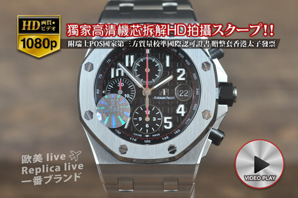 Audemars Piguet愛彼(JF工廠-1080p視屏)皇傢橡樹離岸型系列 316F精鋼磨砂表殼-精鋼表帶 Cal.3126自動計時機芯尺寸 表殼直徑42mm x厚度16mm機芯 Cal.3126自動計時碼表機械機芯基礎機芯:Asian 7750 計時碼表自動機械機芯、12點位小秒、擺輪頻率:每小時28800 次功能 時針、分針、秒針(12點位小盤)、日期(3點位窗式帶放大鏡顯示)9點位小秒針 – 分鐘顯示、6點位小秒針 – 小時顯示2點位按把 – 開始/停止 計時、4點位按把 – 復位計時碼表表殼 316F不銹鋼磨砂表殼,表殼分為中框、表圈、後蓋組成表圈 精鋼磨砂表圈、黑色內表圈玻璃材質 透明抗磨損藍寶石玻璃面盤 黑色表盤鐫刻“Méga Tapisserie”超大型格紋裝飾,黑色定時器、白色夜光顯示色阿拉伯數字時標表帶 316L不銹鋼鏈節表帶、AP精鋼折迭扣後蓋 透視後蓋,316L銹鋼與透明藍寶石玻璃表冠 鎖入式表冠(黑色陶瓷包裹精鋼材料)、2點位與4點位按把為黑色陶瓷材料是否防水 生活防水