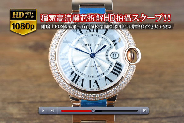 Cartier卡地亞(男表)Ballon bleu藍氣球系列腕表 電鍍18K玫瑰金表殼-外圈鑲嵌水鉆-裝載A-2824自動機芯 系列 Ballon bleu尺寸 表殼直徑42mm x厚度13mm機芯 Asian 2824-2 25J自動機械機芯、擺輪頻率:每小時28,800次功能 時針、分針、中心大秒針、日期(3點位窗式顯示)表殼 316L不銹鋼材質-拋光工藝-電鍍18k玫瑰金、表殼分為外框-中框以及後蓋組成表圈 外圈鑲嵌2圈水鉆、316L不銹鋼材質-電鍍18k玫瑰金玻璃材質 弧形透明抗磨損藍寶石玻璃面盤 銀色波紋面盤、黑色羅馬數字時標表帶 316L不銹鋼鏈節表帶電鍍18k玫瑰金、搭配按壓折迭扣後蓋 316L不銹鋼材質-磨砂工藝電鍍18k玫瑰金、以8顆螺絲鎖入固定表冠 推拉式表冠是否防水 生活防水