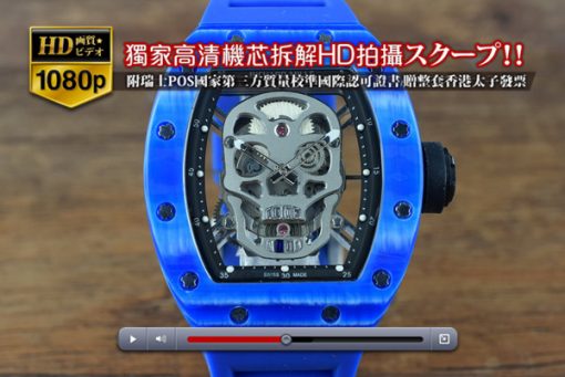 Richard Mille理查德米勒(KV工廠)RM52-01型號 藍色鍛造碳纖維材質-裝載日本6T51自動機械機芯 尺寸 表殼直徑43mm x長度50mm x 厚度17mm機芯 Japanese 6T51自動機械機芯、擺輪頻率:每小時21600次功能 時針、分針表殼 表殼分為上中下3層設計,表殼上層以及背蓋采用藍色鍛造碳纖維材質雕琢而成、中框采用不銹鋼材質表圈 鍛造碳纖維材質玻璃材質 透明弧面-抗磨損藍寶石玻璃面盤 鏤空面盤、骷髏頭裝飾、黑色內圈、夜光點時標表帶 藍色橡膠表帶、磨砂折迭扣後蓋 藍色鍛造碳纖維材質與藍寶石玻璃、以8顆五角螺絲鎖入固定表冠 推拉式表冠是否防水 生活防水