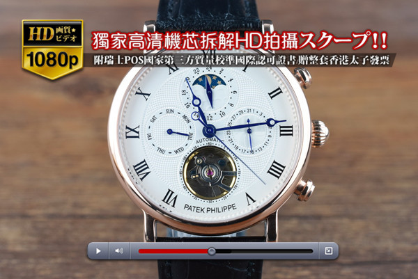 Patek Philippe百達翡麗(男表)Grand-complications系列腕表 電鍍玫瑰金表殼-圓拱形表圈 裝載Asian21J自動機芯 系列 Grand-complications 尺寸 表殼直徑42mm x厚度14mm機芯 Asian 21J自動機械機芯、擺輪頻率:每小時21,600 次功能 時針、分針、中心大秒針、日歷(3點位指標指示)星期(9點位指針指示)、24小時(12點位指針指示)表殼 304型材不銹鋼拋光表殼-電鍍18k玫瑰金,表殼分為中框、表圈、後蓋組成表圈 304型材不銹鋼-圓拱形外圈-電鍍18k玫瑰金玻璃材質 透明礦物玻璃面盤 白色面盤、油印黑色羅馬數字時標表帶 黑色皮質表帶、不銹鋼針式扣-電鍍18k玫瑰金後蓋 透視後蓋-304精鋼搭配透明玻璃表冠 推拉式表冠是否防水 生活防水