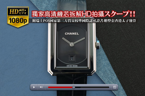 Chanel香奈兒(BV工廠-女表)BOY?FRIEND系列腕表 不銹鋼材質拋光表殼-裝載石英機芯 特別版介紹 線條簡約純粹,設計平衡有度,造型臻美。BOY?FRIEND腕表散發含蓄低調的氣度。以大膽率性的全新外觀展現颯爽的中性風格,高貴典雅。系列 BOY?FRIEND尺寸 表殼直徑26.8mm x長度34.6mm x 厚度7.6mm機芯 Swiss quartz movement功能 時針、分針、日歷(6點位窗式顯示)表殼 316L不銹鋼材質-拋光工藝,表殼一體成型玻璃材質 透明抗磨損藍寶石玻璃,8角形鉆石切割面盤 黑色面盤表帶 黑色小牛皮、Chanel專利表扣後蓋 316L不銹鋼材質-磨砂工藝,以4顆螺絲鎖緊固定表冠 推拉式表冠、不銹鋼鑲嵌蛋面切割縞瑪瑙是否防水 生活防水