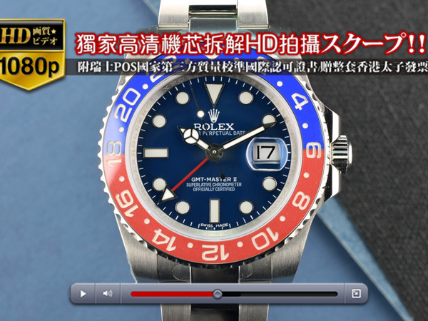 Rolex勞力士(男表)GMT-Master格林尼治型II系列腕表 316L不銹鋼表殼-真正的紅藍雙色陶瓷圈-裝載A2836-2自動機械機芯 特點 民航機時代的一個傳奇,格林尼治型備受泛美航空的飛行員擁戴,成為機上領航的天文臺腕表。經典雙時區腕表,配備箭頭形24小時指標及漸進刻度旋轉式外圈。為緊密聯系的世界,帶來風格時尚、完美的領航之道。系列 GMT-Master尺寸 表殼直徑40mm x厚度12.5mm機芯 Asian 2836-2 25J自動機械機芯、擺輪頻率:每小時28,800 次功能 時針、分針、中心大秒針、GMT時針指示、日期(3點位窗式帶放大鏡顯示)表殼 316L不銹鋼表殼-側面拋光正面拉絲,表殼分為中框、表圈、背蓋組成表圈 316L不銹鋼-單向棘輪轉動表圈市面上真正的第一款紅藍雙色陶瓷材質的表圈玻璃材質 透明抗磨損藍寶石玻璃面盤 藍色表盤、圓形/長方形/三角形組合成的具有夜光顯示時標表帶 316L不銹鋼鏈節表帶、不銹鋼折迭扣後蓋 旋入式鎖緊、316L不銹鋼材質表冠 鎖入式表冠是否防水 生活防水