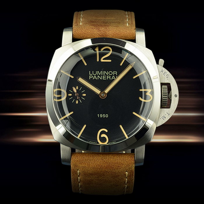 系列:Luminor 1950尺寸:錶殼直徑47mm x 厚度16mm機芯:Asian P3000手動上鏈機械機芯功能:時針、分針、小秒針(9點位小秒)錶殼:304型材不銹鋼材質-磨砂工藝,錶殼分為中框、表圈、後蓋組成表圈:304型材不銹鋼材質-拋光工藝面盤:黑色面盤、夜光顯示阿拉伯數字以及小時時標錶帶:棕色皮革錶帶、不銹鋼針式大扣後蓋:旋入式-不銹鋼材質以及透明礦物玻璃表冠:推拉式(PANERAI專利護橋)玻璃材質:透明礦物玻璃是否防水:生活防水