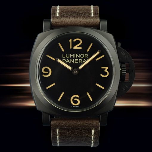 系列:Luminor 1950尺寸:表殼直徑47mm x 厚度16mm機芯:Asian P3000手動上鏈機械機芯功能:時針、分針表殼:304型材不銹鋼材質-黑色PVD塗層,表殼分為中框、表圈、後蓋組成表圈:304型材不銹鋼材質-黑色PVD塗層面盤:黑色面盤、夜光顯示阿拉伯數字以及小時時標表帶:棕色皮革表帶、黑色PVD塗層針式大扣後蓋:旋入式-黑色PVD塗層以及透明礦物玻璃表冠:推拉式(PANERAI專利護橋)玻璃材質:透明礦物玻璃是否防水:生活防水
