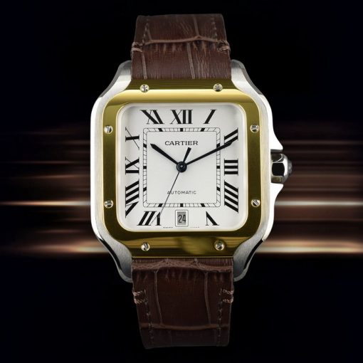 系列:Santos尺寸:表殼直徑39.8mm x 高47.5mm x厚度9.5mm機芯:Japanese miyota 9015自動機械機芯功能:時針、分針、中心大秒針、日期(6點位窗式顯示)表殼:316L不銹鋼材質-磨砂工藝、表殼分為外框-中框以及後蓋組成表圈:316L不銹鋼外框-拋光工藝-電鍍黃金面盤:白色面盤、黑色羅馬數字時標表帶:棕色牛皮表帶、搭配不銹鋼折迭扣後蓋:316L不銹鋼材質-磨砂工藝、以8顆螺絲鎖入固定表冠:推拉式玻璃材質:透明抗磨損藍寶石玻璃是否防水:生活防水