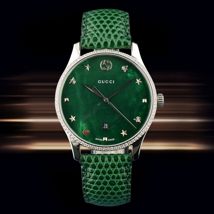 系列:G-Timeless尺寸:表殼直徑36mm x厚度9.5mm機芯:Japanese quartz movement功能:時針、分針、中心大秒針、日期(6點位窗式顯示)表殼:304型材不銹鋼材質-拋光工藝,表殼分為中框、表圈、背蓋組成表圈:304型材不銹鋼-CNC鑲嵌鋯石面盤:綠色珍珠母面盤表帶:綠色皮質表帶、搭配不銹鋼針式扣後蓋:不銹鋼後蓋、壓入扣緊表冠:推拉式玻璃材質:抗磨損藍寶石玻璃是否防水:生活防水