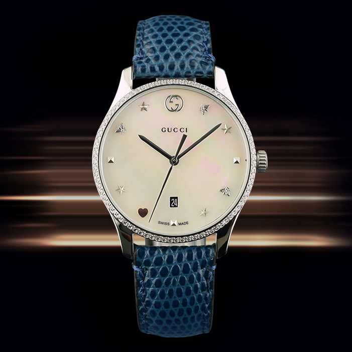 系列:G-Timeless尺寸:表殼直徑36mm x厚度9.5mm機芯:Japanese quartz movement功能:時針、分針、中心大秒針、日期(6點位窗式顯示)表殼:304型材不銹鋼材質-拋光工藝,表殼分為中框、表圈、背蓋組成表圈:304型材不銹鋼-CNC鑲嵌鋯石面盤:白色珍珠母面盤表帶:藍色皮質表帶、搭配不銹鋼針式扣後蓋:不銹鋼後蓋、壓入扣緊表冠:推拉式玻璃材質:抗磨損藍寶石玻璃是否防水:生活防水