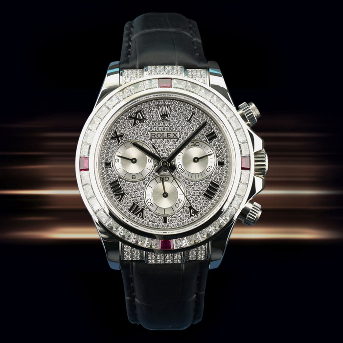 系列:Daytona尺寸:表殼直徑40mm x厚度14.5mm機芯:Asian 7750 25J自動計時碼表機芯、擺輪頻率:每小時28,800次功能:時針、分針、中心大秒針計時功能:3點位小秒針 – 30分鐘顯示、9點位小秒針 – 12小時顯示 2點位按把 – 開始/停止 計時、4點位按把 – 復位計時碼表表殼:316L不銹鋼拋光表殼,表殼分為中框、表圈、後蓋組成表圈:316L不銹鋼材質-鑲嵌方形鋯石面盤:銀色面盤-鑲嵌鋯石、黑色羅馬數字時標表帶:黑色牛皮表帶、搭配不銹鋼折迭扣後蓋:旋入鎖緊-不銹鋼材質表冠:鎖入式表冠玻璃材質:透明抗磨損藍寶石玻璃是否防水:生活防水