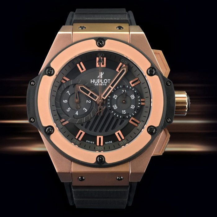 系列:Kingpower 尺寸:表殼直徑48mm x厚度17mm機芯:Asian 7750計時碼表自動機械機芯、擺輪頻率:每小時28,800 次功能:時針、分針、小秒針(9點位)、日歷(4點位窗式顯示)計時功能:中心計時大秒針、9點位小盤-計時30分鐘、2點位按鈕 – 開始/暫停計時、4點位按鈕 – 復位計時功能表殼:316L不銹鋼材質-電鍍玫瑰金,表殼分為中框、表圈、背蓋組成表圈:316L不銹鋼表圈-電鍍玫瑰金玻璃材質:透明抗磨損藍寶石玻璃面盤:黑色面盤、玫瑰金小時標示、劍形鏤空表針表帶:黑色橡膠表帶、玫瑰金折迭扣後蓋:透視後蓋、316L精鋼電鍍玫瑰金-搭配透明藍寶石玻璃表冠:推拉式是否防水:生活防水