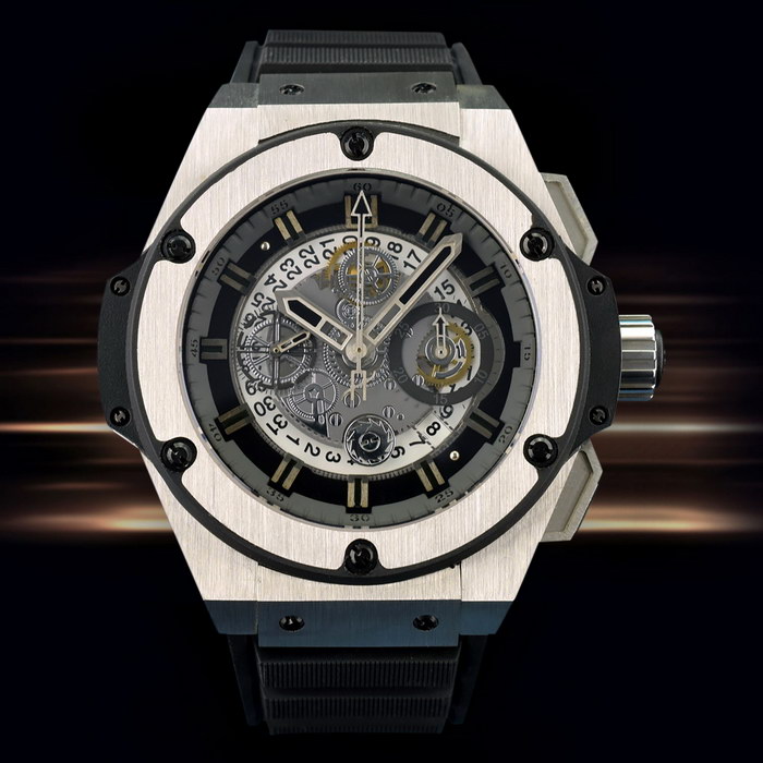 系列:Kingpower 尺寸:表殼直徑48mm x厚度17mm機芯:Asian 7750計時碼表自動機械機芯、擺輪頻率:每小時28,800 次功能:時針、分針、小秒針(9點位)、日歷(4點位窗式顯示)計時功能:中心計時大秒針、9點位小盤-計時30分鐘、2點位按鈕 – 開始/暫停計時、4點位按鈕 – 復位計時功能表殼:316L不銹鋼材質,表殼分為中框、表圈、背蓋組成表圈:316L不銹鋼表圈玻璃材質:透明抗磨損藍寶石玻璃面盤:鏤空面盤、不銹鋼小時標示、劍形鏤空表針表帶:黑色橡膠表帶、不銹鋼折迭扣後蓋:透視後蓋、316L精鋼搭配透明藍寶石玻璃表冠:推拉式是否防水:生活防水