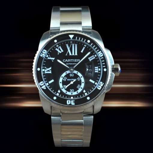 系列:Calibre de Cartier尺寸:表殼直徑42mm x厚度11.5mm機芯:Asian sea-gull ST自動機械機芯、擺輪頻率:每小時21,600次功能:時針、分針、秒針(6點位小盤)、日期(3點位窗式顯示)表殼:304型材不銹鋼磨砂表殼,表殼分為中框、表圈、背蓋組成表圈:304型材不銹鋼-單向棘輪旋轉面盤:黑色面盤、白色羅馬數字時標表帶:304型材不銹鋼-鏈節表帶、按壓折迭扣後蓋:316L不銹鋼材質、以8顆螺絲鎖入固定表冠:推拉式玻璃材質:透明礦物玻璃是否防水:生活防水