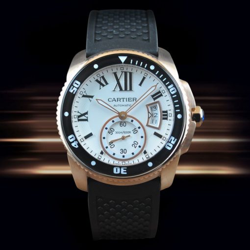 系列:Calibre de Cartier尺寸:表殼直徑42mm x厚度11.5mm機芯:Asian sea-gull ST自動機械機芯、擺輪頻率:每小時21,600次功能:時針、分針、秒針(6點位小盤)、日期(3點位窗式顯示)表殼:304型材不銹鋼磨砂表殼-電鍍玫瑰金,表殼分為中框、表圈、背蓋組成表圈:304型材不銹鋼-電鍍玫瑰金-單向棘輪旋轉面盤:白色面盤、黑色羅馬數字時標表帶:黑色橡膠表帶、玫瑰金針式扣後蓋:316L不銹鋼材質-電鍍玫瑰金、以8顆螺絲鎖入固定表冠:推拉式玻璃材質:透明礦物玻璃是否防水:生活防水