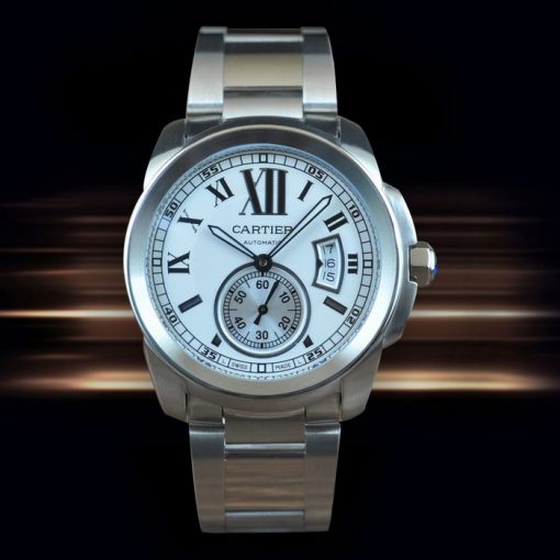 系列:Calibre de Cartier尺寸:表殼直徑42mm x厚度11.5mm機芯:Asian sea-gull ST自動機械機芯、擺輪頻率:每小時21,600次功能:時針、分針、秒針(6點位小盤)、日期(3點位窗式顯示)表殼:304型材不銹鋼磨砂表殼,表殼分為中框、表圈、背蓋組成表圈:304型材不銹鋼-磨砂工藝面盤:白色面盤、黑色羅馬數字時標表帶:304型材不銹鋼-鏈節表帶、按壓折迭扣後蓋:316L不銹鋼材質與透明玻璃、以8顆螺絲鎖入固定表冠:推拉式玻璃材質:透明礦物玻璃是否防水:生活防水