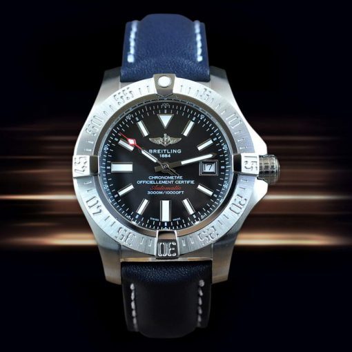 系列:Avenger II尺寸:表殼直徑45mm x厚度18mm機芯:Asian 2824-2 25J自動機械機芯、擺輪頻率:每小時28,800 次功能:時針、分針、中心大秒針、日期(3點位窗式顯示)表殼:316L型材不銹鋼材質,表殼分為中框、表圈、背蓋組成表圈:單向棘輪式表圈面盤:黑色表盤,精鋼阿拉伯數字和覆蓋有白色夜光塗層小時時標表帶:藍色皮質表帶、精鋼針式大扣後蓋:旋轉擰緊、不銹鋼材質-拋光工藝表冠:旋轉擰緊、雙密封膠墊玻璃材質:弧形透明抗磨損藍寶石玻璃是否防水:生活防水
