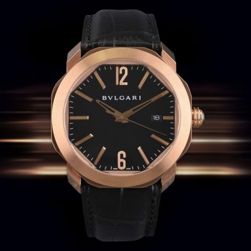 系列:OCTO ROMA尺寸:表殼直徑41mm x 厚度11mm機芯:Japanese miyota 9015自動機械機芯、擺輪頻率:每小時21,600次功能:時針、分針、中心大秒針、日歷(3點位窗口顯示)表殼:316L不銹鋼材質-磨砂工藝-電鍍18k玫瑰金、整個表殼由表圈-中框-後蓋組成表圈:316L不銹鋼表圈-磨砂工藝-電鍍18k玫瑰金面盤:黑色面盤、阿拉伯數字以及玫瑰金小時時標表帶:黑色皮質表帶、玫瑰金針式扣後蓋:316L不銹鋼材質-電鍍18k玫瑰金與藍寶石玻璃、以4顆螺絲鎖入固定表冠:旋入鎖緊玻璃材質:透明抗磨損藍寶石玻璃是否防水:生活防水