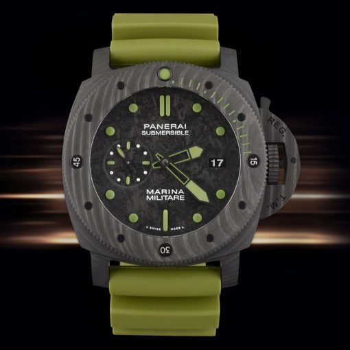 系列:Luminor Submersible尺寸:表殼直徑47mm x 厚度17mm機芯:P.9010自動機械機芯(基礎機芯:Asian 25J定制機芯、擺輪頻率:每小時28,800次)功能:時針、分針、秒針(9點位小秒)、日歷(3點位窗式顯示)(定制機芯與原版功能一致,表冠拉出到第一檔-單獨調節時針,調時針走24小時以調整日歷)表殼:鍛造碳纖維材質,表殼分為中框、表圈、後蓋組成表圈:鍛造碳纖維材質、單向棘輪轉動面盤:鍛造碳纖維材質、夜光顯示時標表帶:黃色橡膠表帶、PANERAI針式大扣後蓋:旋入鎖緊、316L不銹鋼-PVD鍍層表冠:鍛造碳纖維材質-推拉式(PANERAI專利護橋)玻璃材質:弧形透明抗磨損藍寶石玻璃是否防水:生活防水