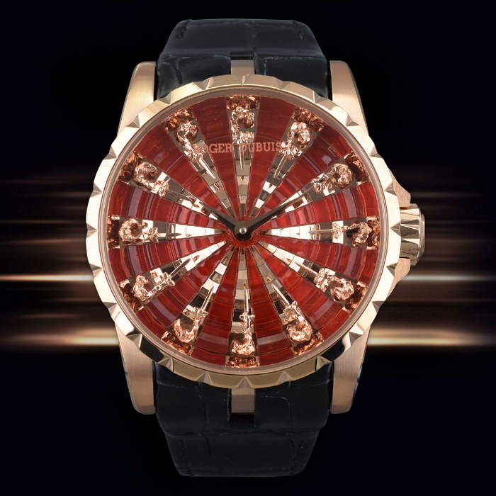 系列:Excalibue 尺寸:表殼直徑45mm x 厚度16mm機芯:日本MIYOTA自動機械機芯功能:時針、分針表殼:316L不銹鋼材質-電鍍玫瑰金,表殼分為中框、表圈、後蓋組成表圈:316L不銹鋼材質-電鍍玫瑰金面盤:紅色面盤、12騎士雕像時標表帶:黑色小牛皮表帶、按壓折迭扣 後蓋:316L精鋼-電鍍玫瑰金表冠:旋入鎖緊玻璃材質:透明抗磨損藍寶石玻璃是否防水:生活防水
