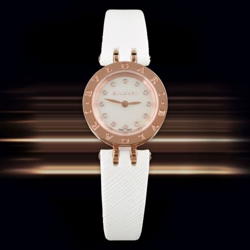 系列:B.zero1尺寸:表殼直徑23mm x 厚度10mm機芯:瑞士RONDA石英機芯功能:時針、分針表殼:316L不銹鋼材質、由表圈-中框-後蓋組成表圈:316L型材不銹鋼-電鍍18k玫瑰金表盤:白色珍珠母貝、鉆石時標表帶:白色皮質表帶-手掌紋壓紋、玫瑰金針式扣後蓋:316L不銹鋼材質(品牌logo以及系打印記雕刻)表冠:後蓋隱藏式按壓調節玻璃材質:透明藍寶石玻璃是否防水:生活防水