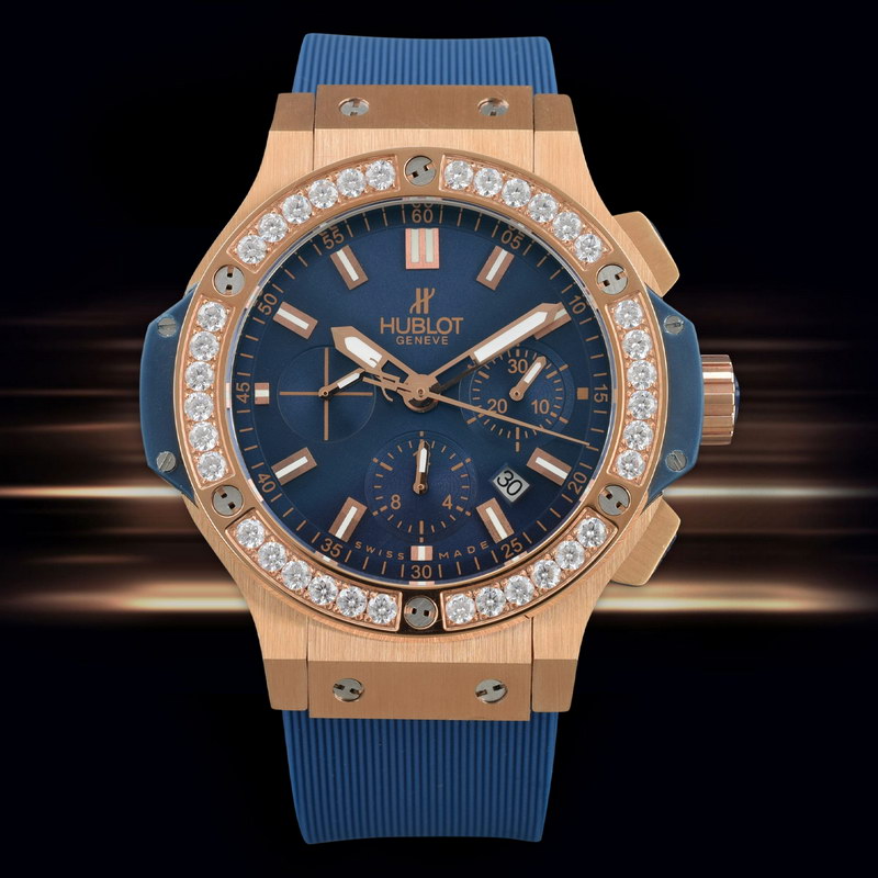 系列:Bigbang尺寸:表殼直徑44mm x 厚度15mm機芯:Asian 7750計時碼表自動機械機芯、擺輪頻率:每小時28,800次功能:時針、分針、小秒針、日歷、計時碼表功能表殼:316L不銹鋼材質-電鍍玫瑰金,表殼分為中框、表圈、後蓋組成表圈:316L不銹鋼材質-電鍍玫瑰金-CNC鑲嵌鋯石玻璃材質:透明抗磨損藍寶石玻璃面盤:藍色面盤、玫瑰金小時時標表帶:藍色橡膠表帶、電鍍玫瑰金折迭扣後蓋:透視後蓋、不銹鋼材質-電鍍玫瑰金搭配透明藍寶石玻璃表冠:推拉式是否防水:生活防水